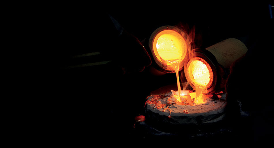 Le métal précieux est tout d’abord chauffé afin d’atteindre sa température de fusion et de passer à l’état liquide. Le cylindre avec«l’arbre de cire»est préalablement chauffé afin de faire disparaître la cire et d’éviter un choc thermique lors de la coulée du métal fondu.Lors de la coulée de fonte, le métal liquide prend la forme de« l’arbre à cires »dans le cylindre de fonte. Après refroidissement, le cylindre est brisé afin de libérer« l’arbre de fonte »,puis le plâtre est définitivement retiré à l’aide d’un jet d’eau à haute pression.