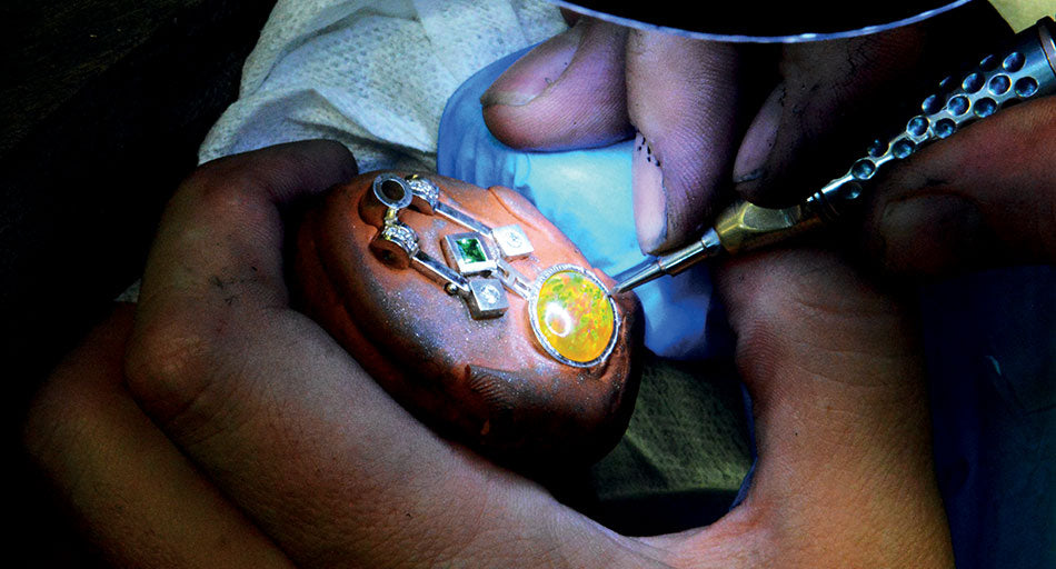 Chaque infime partie du futur bijou doit êtreébavurée, limée, émerisée puis polieafin que le rendu soit irréprochable. Le métal brut est travaillé avec des outils abrasifs, nous commençons avec un gros-grain qui permet d’enlever l’aspect brut et d'égaliser les surfaces du bijou.Nous utilisons ensuite des grains toujours plus fins avec le feutre et le coton qui donneront l’aspect brillant au bijou. Cette étape dutravail du bijoubrut peut prendre de quelques heures à plusieurs jours suivant les difficultés du montage, de la préparation et de la complexité de la pièce.