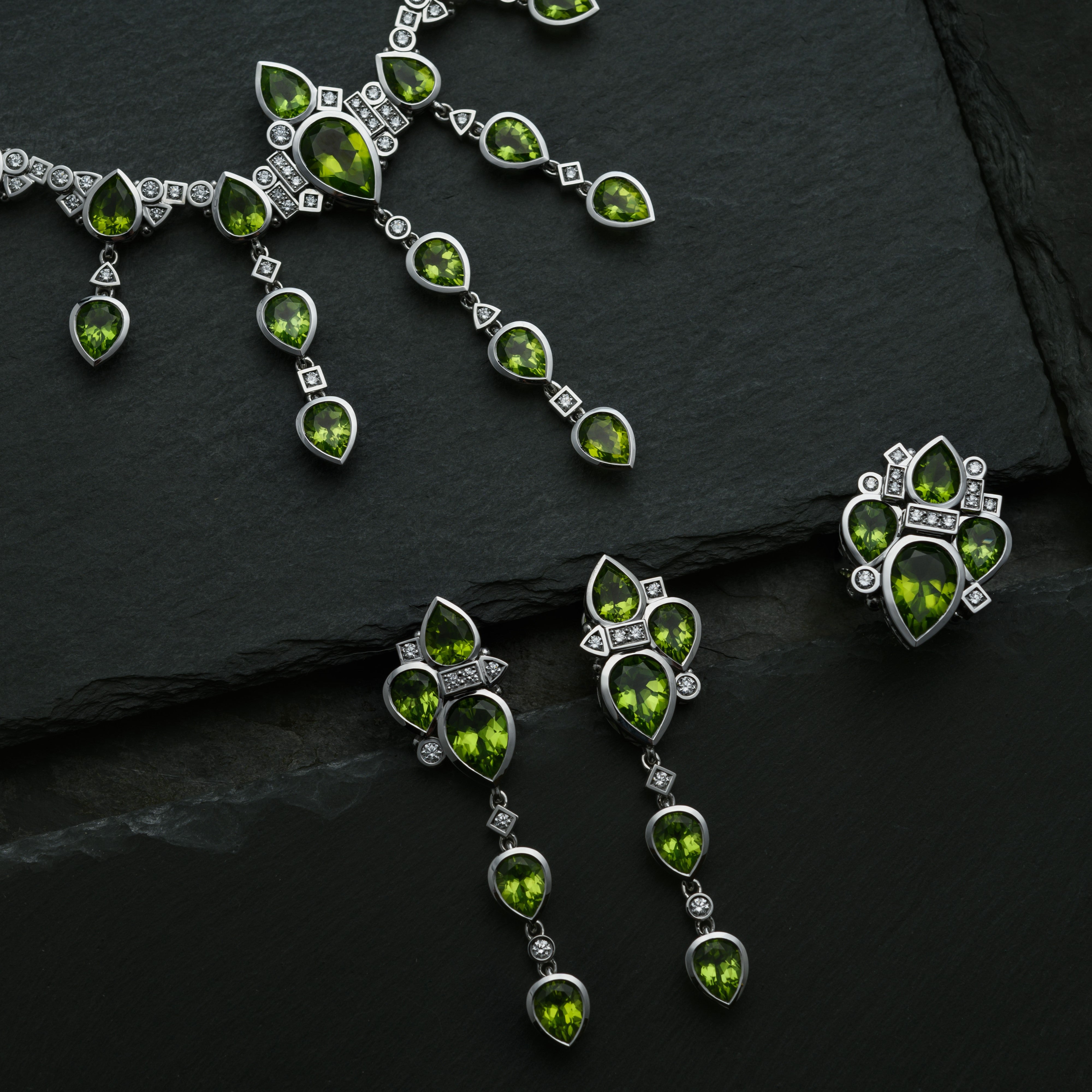 L'histoire de cette parure commence par une quête d'inspiration, où le créateur Mathieu Tournaire, expert en création de bijoux uniques, c’est immergé dans l'univers fascinant des pierres précieuses. Le péridot, avec ses nuances verdoyantes et sa brillance éclatante, a été choisi pour sa capacité à capturer la lumière et à évoquer la nature. Chaque bijou de la collection est le fruit de techniques artisanales en joaillerie française, alliant savoir-faire traditionnel et design contemporain.